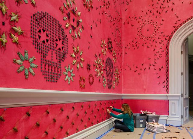 Having a poke around the web for inspiration recently, we came upon Jennifer Angus' installation 'The Midnight Garden' for the recently renovated Renwick Gallery in Washington DC's 'Wonder' exhibition. Our collective reaction went something like.... 1. Oooh nice patchy patterned pink wall finish 2. Look at those amazing green insects, they look great on the pink